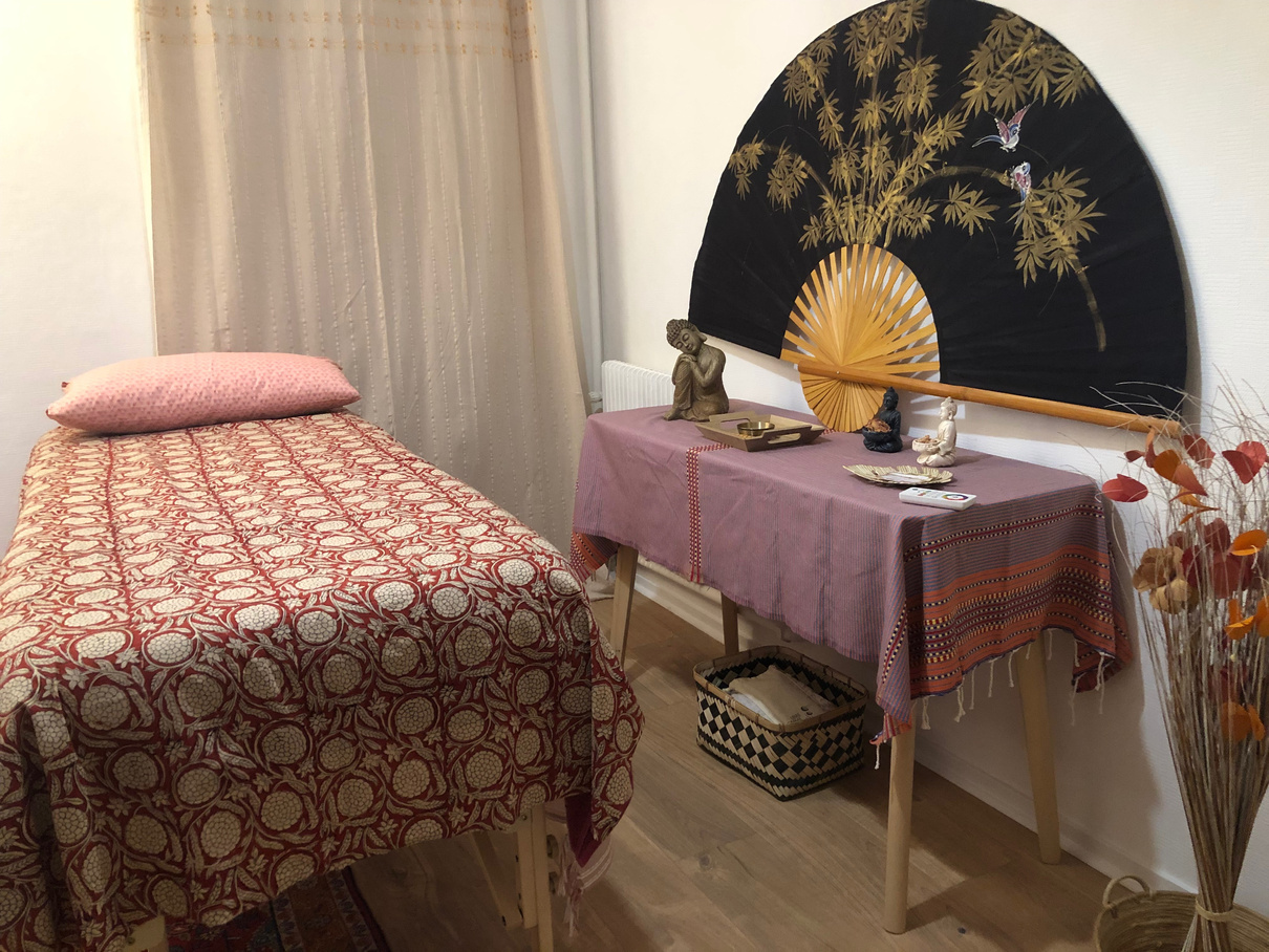 Puis, je vous invite à vous installer confortablement sur la table de massage. Vous restez habillée, en ayant les pieds nus. (venez de préférence dans une tenue confortable). Vous êtes en position allongée sur le dos. La séance se déroule dans une ambiance musicale douce. J’utilise de l’huile végétale bio de noyaux d’abricot pour le massage. Le soin dure entre 30 minutes et 1 heure selon le type de séance choisi. Le soin commence et vous pouvez alors vous détendre et lâcher-prise physiquement et mentalement le temps de la séance. Une couverture est à votre disposition pour vous couvrir si besoin.